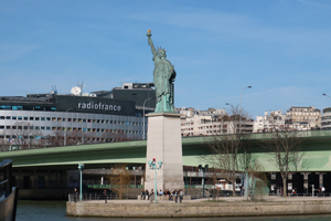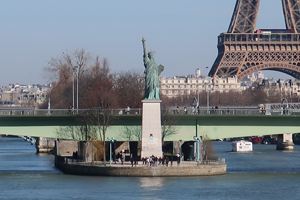さて、川沿いの道をさらに下流へと歩いて行き、Pont de Grenelle(グレネル橋)を過ぎてから再び後ろを振り返るとPont de Grenelleの中央付近に意外なものが見られます。意外なものとは「Statue de la Liberte Paris(パリの自由の女神)」です。