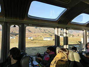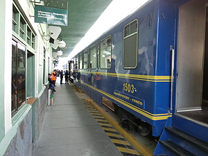 午後3時20分に Aguas Calientes(アグアス カリエンテス)という町のMchu Picchu駅からVistadomeに乗って、途中車掌らによるアトラクション、ファッションショーを見たり、3回くらい急停車したりしながら、到着時刻から約30分程遅れて夜7時半にPoroy駅に到着。英語ガイドが待っていてすかさずホテルへとバンで移動。