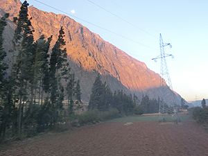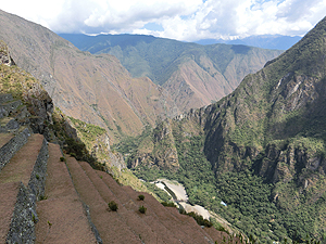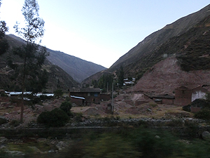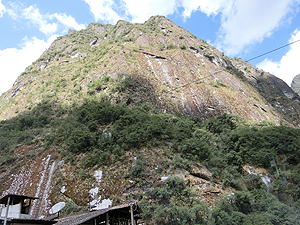 Pory駅を6:40に出発したVistadome号は3時間くらいかけて、切り立った崖の下、ウルバンバ川(Rio Vilcanota)に沿って谷底をゆっくりと進みます。Macchu Pichuまで距離にして130kmくらいです。途中停車するのは標高約2,600mにあるOllantaytambo駅のみ。ここには切り立った断崖絶壁の途中に、登山者向けの宿泊施設が岩壁にへばりついている。