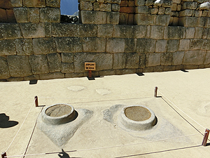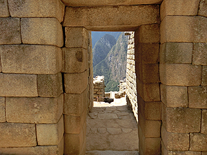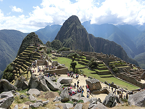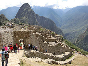 ここから英語ガイドに色々と説明をして貰ってMachu Picchu内を歩きます。先ずは”見張り小屋(Recinto del Gurdian)”に登ってMchupicchuの全景を眺めます。Machu Picchuは単独で存在するのでは無く、周りの山の頂上にも神殿があり、インカ・トレイル(登山道)で,結ばれています。有名なのはHuayna Picchu(老いた峰)。Machu Picchuからでも神殿跡が見えます。その他にもCuscoへ向かう側の山頂にも神殿や門があったりする。これらを全て統合してMacchu Picchuが存在している。