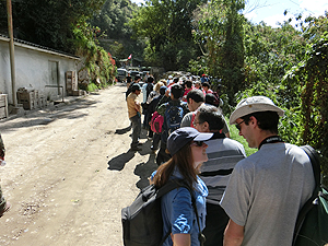 食後、列車に乗り遅れると今後5日間は満席で席が取れないと脅され、午後2時前には下りのバス待ち行列を延々と待ち、Macchu Picchu村のツーリストオフィスには午後2時45分頃に着いた。