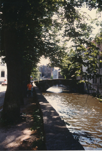 ブルグ広場から運河を渡る橋が見えます。この辺りは観光船の船着き場です。ちいさな船ですが、のんびりと町を周遊するのに便利です。この辺りの運河沿いにはよく骨董品の市が出ます。道路沿いにはレース/刺繍のお店やお土産物のお店が軒をならべます。