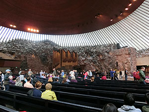 トラムでTemppeliaukion kirkko(テンペリアウキオ教会)へ行く予定でしたが、トラムがあまり動いていない感じだったのでホテルから徒歩で行きました。15分程度。岩盤に作られたルーテル派の教会で素敵なデザインです。でも韓国や中国の団体客が多く、「静かに」のアナウンスも直後は効き目があるが、すぐに喧噪に包まれる。ちょっと興ざめですが、建物、空間デザインはさすがです。