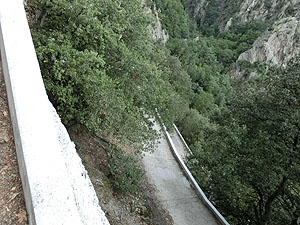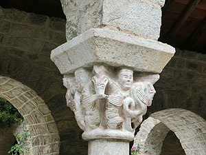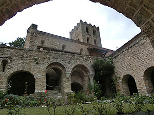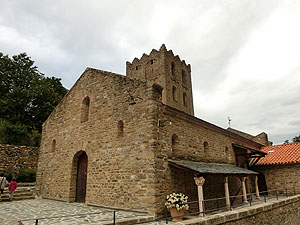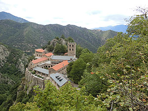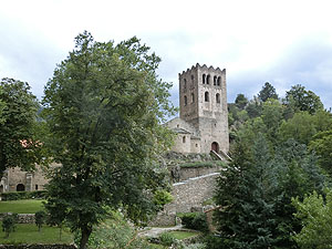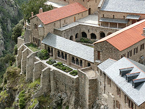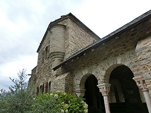 2017.09.01 <概要> Casteilのホテルから徒歩40分でAbbaye Saint-Martin du Canigou(サン・マルタン・デュ・カニグー修道院)です。静かな山間にぽつんと修道院が建てられています。麓のCugugnanからは全く見えません。内部は決められた時間ごとに修道士が案内してくれることになっています。それなりに日本人も来るのでしょう。日本語で書かれた共用のパンフレットもありました。ごくたまに小型の四輪駆動車が登ってくるのですが、どうやらCasteilから2kmほど北にある温泉町Vernet-les-Bainsからのツアーがあるようです。お年寄りはそういうツアーに参加すると楽でいいですね。 この修道院が初めて文献に登場するのは997年。教会は1009年11月10日にAbbaye de Saint-Michel de Cuxaを増築したエルヌ司教オリバによって聖別され、聖母マリア、聖マルタン、聖ミシェルへ献堂されましたが、12世紀にはサント=マリー・ド・ラグラス修道院(オード県ラグラス)に併合され、摩擦を生じて回復が困難なほど衰退しました。 1428年2月のカタルーニャ大地震により深刻な被害を受け、1506年に修道院はフランス王家の管理下に置かれ、1782年、ルイ16世によって教会財産は国有化されました。フランス革命後の恐怖政治時代、最後の修道士らが追放された後で修道院は閉鎖され、修道院内の財物は四散。1889年、フランス歴史記念物に指定され、あしたが、修道院の再興は20世紀初頭になってようやく始まりました。1902年にカタルーニャ人であるペルピニャン司教ジュール=ルイ=マリー・ド・カルサラード・デュ・ポン(Jules-Louis-Marie de Carsalade du Pont)が再建に着手した時点では、鐘楼、一部崩壊した教会堂、および下層部回廊の3歩廊しか残されていなかったので再建作業は1932年までかかったようです。1952年から1983年にかけて司祭ベルナール・ド・シャバンヌが修道院の修復工事を行い、宗教生活を復興しました。 |