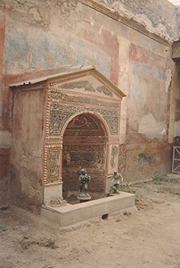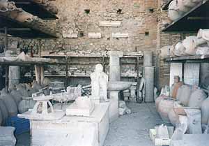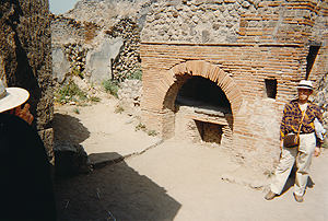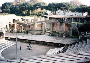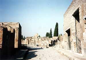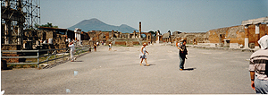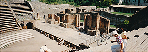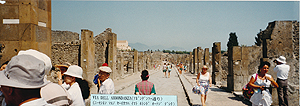 広さは600m×400mくらいありますので、すべてを見てまわると相当な時間を要します。入口のマリーナ門(PORTA MARINA)を抜けると博物館(ANTIQUARIUM)、バジリカ聖堂(BASILICAB(TEMPIO DI APOLONLと続きフォロ(FORO:公共広場)に出ます。フォロにはジョーヴェ神殿(TEMPIO GIOVE)など見所は沢山あります。大劇場(THEATRO GRANDE)やスタビアーネ浴場(TERME SRABIANE)などは当時の娯楽の様子を今に伝えます。