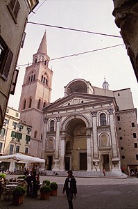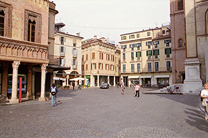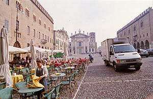 全体に赤茶けた感じの落ち着いた街並みです。魚市場のある漁師通り(Via Pescheria)から北へ向かうと運河(Rio)があり、そこから先が旧市街です。まずはサンタンドレア大聖堂(San Andrea)の前にあるマンテーニャ広場(Piazza Mantegna)へと足を運びました。サンタンドレア大聖堂は1472年から建設が始まり、18世紀になって完成に到っており、まさにゴンザーガ家統治のシンボルのような存在です。その前マンテーニャ広場は大聖堂の前庭程度の小さな”広場”です。