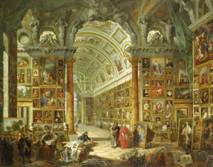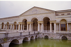 テ館はゴンザーガ家のフェデリコ二世のために16世紀に建てられた別館です。建物全体は200mx100mにもなり、その周囲をその数倍の広さの公園で囲まれた優雅な別邸です。中には市立美術館(Museo Civico)があり、今回訪問した時には興味深い特設展示会が行われていました。興味深い特設展示会とは、18世紀にゴンザーガ家のSilvio Valenti Gonzaga氏が所有し、大広間に所狭しと並べられていた絵画を再現したものでした。その大広間の絵画コレクションは既に散逸して久しいのですが、1749年に画家Giovanni Paolo Pannini氏が描いたテ宮殿内の大広間の絵を詳細に分析し、そこにあったであろう絵画を世界中から集めて来たのでした。Pannini氏が描いた細密な大広間の絵と、今目の前に並んでいる絵画を見比べながら当時の様子に思いをはせます。(2005.5)