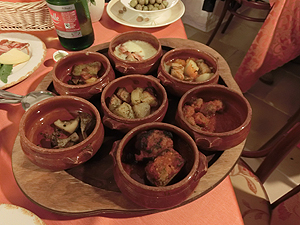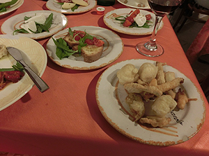 夕食は商業地区Rione Montiの奥にあるレストラン。Vitoが勧めてくれたお店。Aqua con Gas、Antica Negroamaro(赤ワイン)、 Antipasto della Casa、PrimoにOrecchiette con le Rape、SecondiにTrippaで?44。Antipastoはサラミ、パスタ、野菜、チーズ、ブルスケッタ、フライなど6皿、暖かい小7皿が出てくる。豪快な出方です。