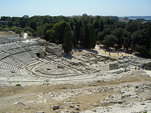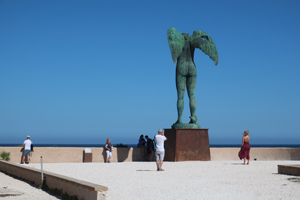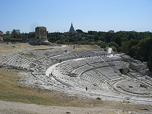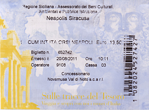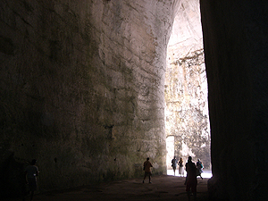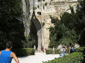 次は本土のParco Archeologico della Neapoli (ネアポリ考古学公園)でギリシャ、ローマ遺跡巡り。ホテルから車で移動。Via Augustoの路上に例の仕切り屋にEURO1払って車を停めます。入場券を買って先ずはAnfiteatro Romano(古代ローマ円形闘技場)を見学。基部しか残っていませんが、Veronaの円形闘技場並みの巨大な闘技場だったようです。次はAra di Ierone II(ヒエロン2世の祭壇)。紀元前3世紀。23mX198mの巨大な祭壇。Orecchio di Dionisio(ディオニュシオスの耳)。採石のために出来た洞窟で入口が耳の形をしていたことから名付けられた。洞窟内の小さな音も反響して入口大きく聞こえる。Grotta d. Condari(縄ない職人の洞窟)は内部の湿気を利用して縄ないが行われていた洞窟。ここから離れてLatomia di S. Veneを行くとTombe di Archimede(アルキメデスの墓)があるが、近づくことは出来ない。Museo Archeologico Regionale Paolo Orsi (州立パオロ・オルシ考古学博物館)には先史時代(紀元前50世紀)からギリシャ・ローな時代の出土品等が展示されている。たまたま古代コイン特別展が開催されており、ギリシャからローマ時代のコインが並べられていた。一部中世のコインもあったが、彫刻精度は古代の方が圧倒的に優れている。博物館の近くにはMadonna delle Lacrima(マドンナ・デッレ・ラクリメの聖所記念堂)の奇妙な高さ90mの円錐型の教会があります。1953年に奇跡が起きた場所に建てられたとか。