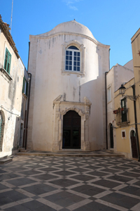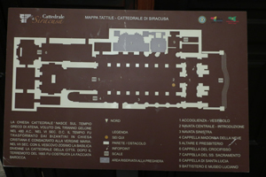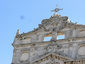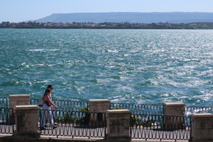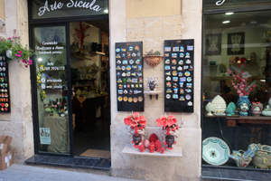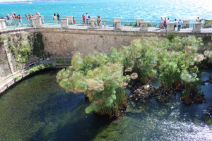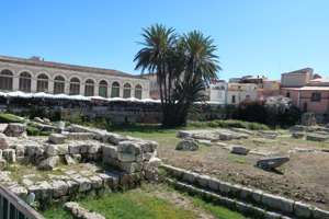 再度Ortigia島の散策です。海岸線のForo ItalicoからPiazza Duomoの出てDuomo内部を見学します。そしてFonte Aretuza(アトゥレーザの泉)へ。古代より淡水が湧き出てパピルスが自生する泉です。今度は島の東側へ行ってみます。Belevedele San Giacomo(サンジャコモ展望台)付近からLungomare di Levantoを通り、辺りの青い海や白いヨットを見ながら歩きます。裏路地を抜けながら建物の様子を楽しみます。彫刻やら建築様式やら。面白い教会がありました。教会の身廊に沿って教会とは別に商店街が組み込まれている。Piazza Archimedeに出ると18世紀のFontana di Artemideが目に入ります。Corso Italicoの先、Tempio di Apollo(アポロ神殿)は、紀元前7世紀のシチリア最古のドーリス式神殿の遺構です。回りの広場は市などが立つ庶民の空間として利用されています。