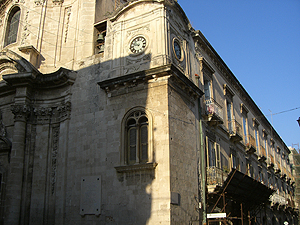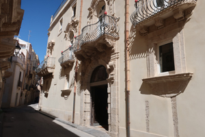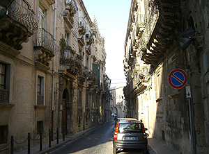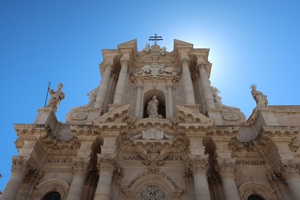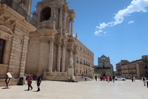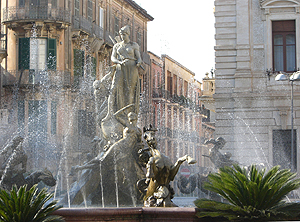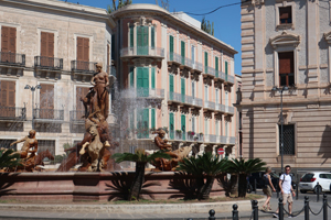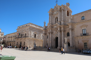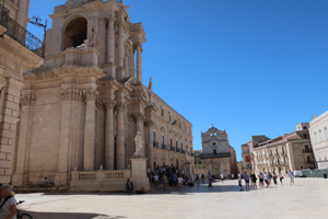 Fontana di Diana(ディアナの噴水)に向かって裏通りを散策してみます。バロック様式の装飾の建物が多く、特にバルコニーの手すりにその特徴が見られます。Fontana di Diana(ディアナの噴水)は新しくて18世紀のものです。そこから旧市街の最大の見どころ Piazza del Duomo(大聖堂広場)へと向かいます。小さなOrtigia島の狭い裏通りばかり歩いてここに出るとパッと開けた空間に豪華なバロック様式の建物が並び、圧倒される空間です。ここは大好きです。