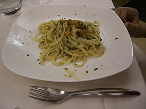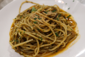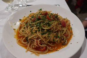 稚魚とミニトマトとぴスタチオのスパゲティSpaghetti al Neonate, Ciliegino e Pistacchio