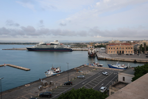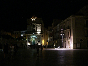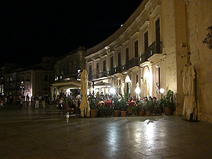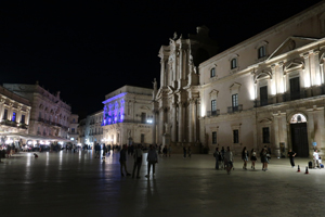 Siracusaはどんな町か?さっそくOrtigia島を散策してみます。ホテルから島のメインストリートCorso Matteottiに出ると、見慣れたブランド品のお店が建ち並びます。一本裏手のVia cavourに入ると狭い通りに土産物屋、レストラン、カフェ、お菓子屋などが建ち並び、人通りも多いようです。そこから海岸通りのForo Italicoに出て一旦ホテルに戻ります。7時過ぎ、ちょっとだけ薄暗くなった頃にレストランを探しに出かけます。WEBで探してあったお目当てはあったのですが、ホテルのフロントでもAl MazariとPorta Marinaがお薦めとの情報を得ました。先ずはWEBで調べたホテルのそばのDarsena。テラス席をテントで囲んだようなシーフード専門店。ありがちなタイプにあまり興味はそそられませんでした。そこかPiazza Duomoへ出た。ハッと息を呑むような美しく、今までにない広い空間。そして荘厳なバロック様式のDuomo。雰囲気は全く違うけれど、SienaのPiazza Campo、CremonaのPiazza del Comuneに匹敵する印象の強さです。これは驚きです。この広場はもともと前ギリシャ期の至聖所があた場所で、1693年の大地震後にバロック様式で周囲が取り囲まれました。独特の華やかで退廃的な雰囲気を醸し出しています。Duomoは、紀元前5世紀のドーリス式アテナ神殿を7世紀に改修し、17-18世紀に大規模な再建工事が行われている。