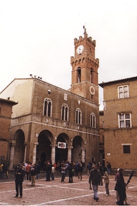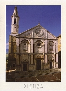 町の中心は小さなピオ2世広場(Piazza PioII)。その周囲にあるのが1462年の大聖堂(Cattedrale)、ピッコロミニ館(Palazzo Piccolomini)、司教館(Palazzo Vescovile)、市庁舎(Palazzo Pubblico)などです。町の東側のムレッロ門(Porta Murello)のフレスコ画は特に印象に残りました。