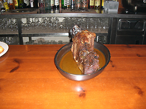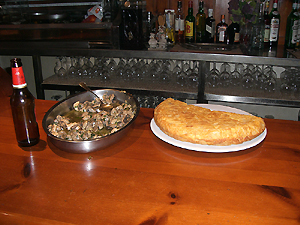 そう決めて再びホテルに戻って8時過ぎにそのバールへと向かいましたが、これは大当たりでした。コテコテのオヤジとおばさんが切り盛りする地元のレストラン兼バールです。まあ、写真を見て下さい。カウンターの天井にはもも肉のハムがぶら下がり、カウンターテーブルの上には幾つか作りおきの料理が並び生ます。これがまた美味しそう。奥にはハモンセラーノをセットして切る道具。雰囲気満点です。英語は通じなかったので、カウンターにあったキノコ料理を頼むのにフランス語なら通じるかと思って”シャンピニオン”と言ってみたのですが全然通じなくて、カウンターまで行って”シャンピニオン!”って指さすとようやく分かってくれました。”オー!チャンピオーネ!チャンピオーネ!とおじさんは親指立てて”ブエノ!ブエノ!”と叫んでいます。どうやらグッドチョイスだと言っているようです。その他にトリッパ、干ダラ料理を頼み、ワインを頼み、夕食開始!トリッパを食べていると、ハモンセラーノを少し切って包丁に切れ端を載せたまま我々のテーブルに持ってきました。どうやら味見をしろと言っているようです。妻が二切れとも取ろうとするとオヤジは”ノ!ウノ!”とか言って、どうやら私と一切れずつ取れと言っていたようでした。とっても美味しかったのですが、もう沢山注文しているので十分でした。どうやら、トーストの上にハモンセラーノを載せて出すのがここの名物料理にようです。雰囲気といい、味といい、ホスピタリティといい、良い思い出になりました。