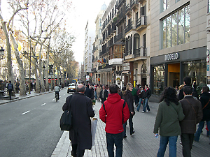 庶民的で土産物屋が多く大道芸人の集まるランブラス通り(La Rambla)、アクセサリー等の卸が立ち並ぶ大寺院前のフェルナンド・ジェイム1世(C. de Fernando Jaime I)、ブランドの店が並ぶハイセンスなグラシア通り(C. de Gracia)など、目的に合わせた散歩ができます。ランブラス通りからちょっと横に入ったレアル広場(Place Real)はランブラスの喧騒からちょっと離れて、ふと一息ついてカフェなどに立ち寄るのに適した場所で、よく利用します。