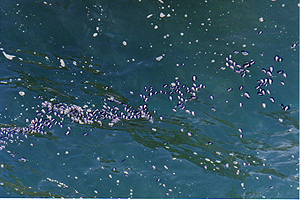 ![]() 海に、青く楕円形の変なものが沢山浮いていた、生き物のようだけど… |