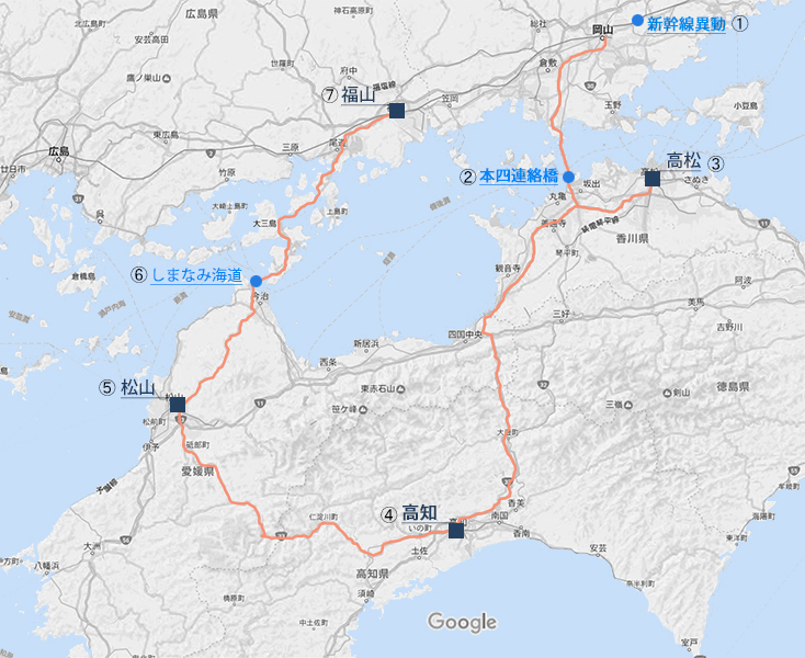 1/2 東京駅から新幹線で岡山下車。レンタカーを借りて高松へ移動。高松泊。